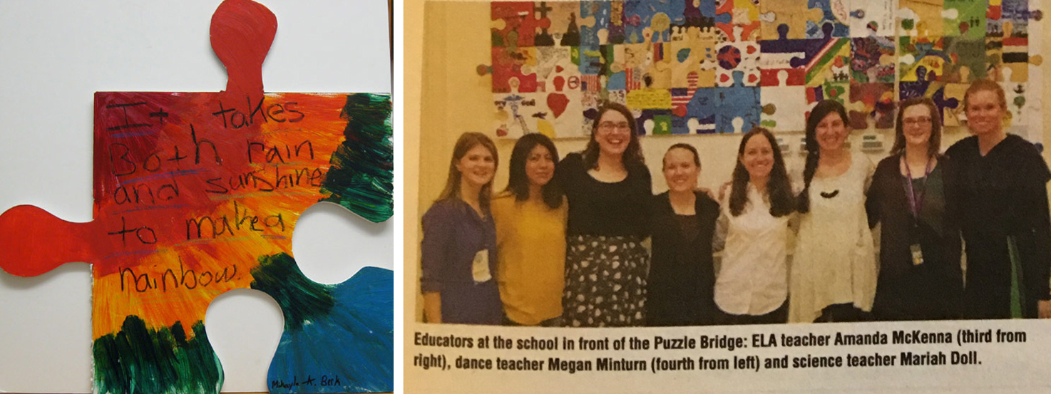 After my experience with Mikayla, the story became part of my standard Puzzle Project introduction to new participating groups. When I discuss different ideas people have for their puzzle piece and why, I tell the story of Mikayla’s piece, “It Takes Both Rain and Sunshine to Make a Rainbow.”